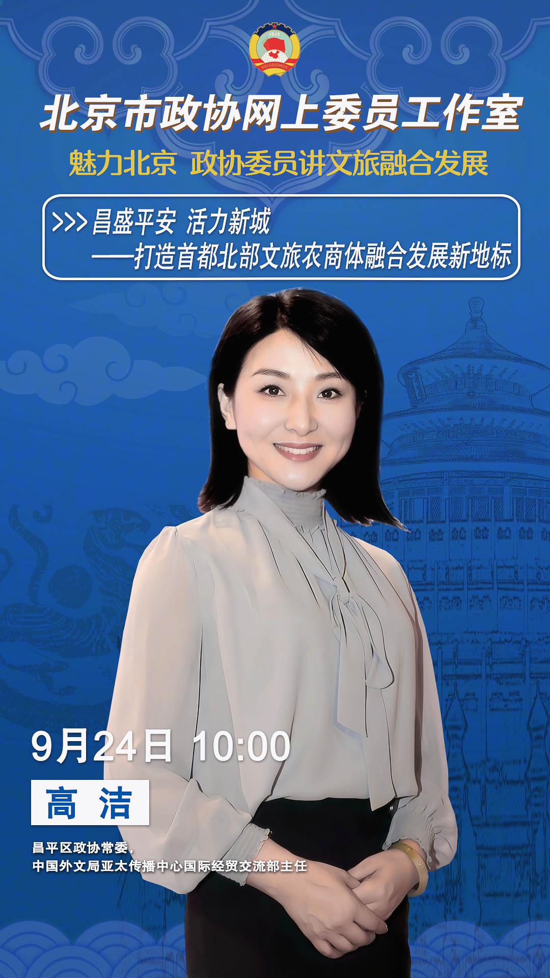 2025年9月24日(周三)上午10:00,北京市政协网上委员工作室“魅力北京 政协委员讲文旅融合发展”第九讲将准时与您见面。昌平区政协常委,中国外文局亚太传播中心国际经贸交流部主任高洁以“昌盛平安 活力新城——打造首都北部文旅农商体融合发展新地标”为题开讲。