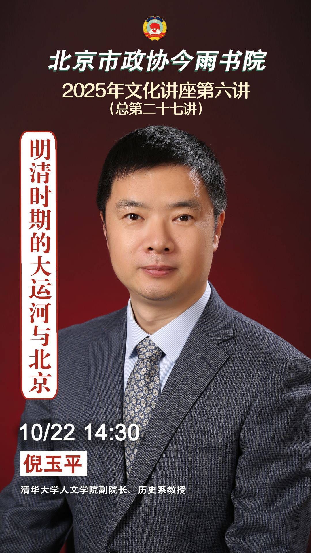 2025年10 月 22 日(星期三)下午 14:30,举办“今雨书院”系列文化讲座2025年第六讲(总第二十七讲),邀请清华大学人文学院副院长、历史系教授倪玉平,以“明清时期的大运河与北京”为题开讲,敬请收看。